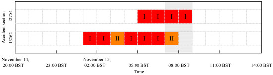 Evolution process of the risk levels of agglomerate fog-related accidents in the accident section (the shading indicates the period when the accident occurred).