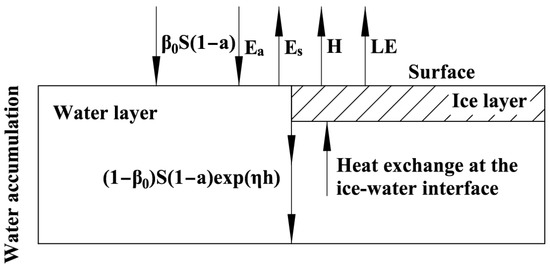 For an unfrozen surface of water, surface temperature calculation has two kinds. One is using the fitting of measured temperature to obtain a periodic function or empirical formula about water temperature at the surface over time []. The other is calculating energy balance of the water at the surface according to meteorological elements including air temperature, wind speed and radiation [], as shown in Figure 1.