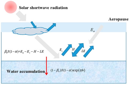exp(ηh) is the solar energy absorbed by depth of water. 0 is the solar absorptivity at the surface. , , and are the heat exchange factors at the surface of water, which can be explained by the equations below.