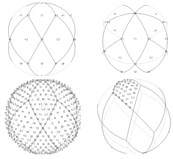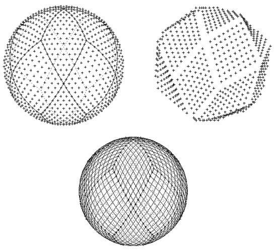 - Baumgardner, J.R.; Frederickson, P.O. Icosahedral discretization of the two-sphere. SIAM J. Numer. Anal. 1985, 22, 1107–1115. [Google Scholar] [CrossRef]