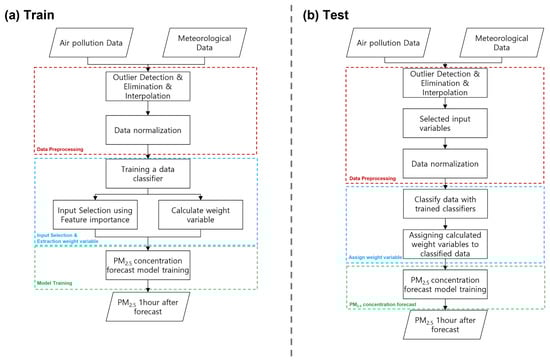 Figure 1 shows a flowchart of the PM concentration forecast method proposed in this study. Figure 1a shows a flowchart for training a model to forecast PM concentrations, and Figure 1b shows a flowchart for testing the trained models to forecast PM concentrations. In the preprocessing step, the outliers were removed from the air pollution and meteorological datasets. Any missing values in the data were obtained using linear interpolation. The preprocessed data were then normalized using the min–max normalization method. To select the input variables for the PM concentration forecast model and generate weight variables to handle the data imbalance problem, we employed a random forest model to classify the data into four grades (Good, Normal, Bad, and Worst). Classified data were assigned weight variables, and a Bi-LSTM model was applied to the selected input variables to train the PM concentration forecast model.