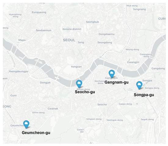 In South Korea, air quality monitoring stations operated by the South Korean Ministry of Environment are used to measure the average air quality concentrations in urban areas. This helps understand the air pollution status, changes, and whether air quality standards are met. In this study, we used air quality monitoring stations operated by the Korean Ministry of Environment in Seoul’s Gangnam-gu, Geumcheon-gu, Seocho-gu, and Songpa-gu neighbourhoods. The station locations are shown in Figure 2, and information on their locations are listed in Table 1. The stations represent the air quality in the southern region of Seoul, specifically in the area located south of the Han River.