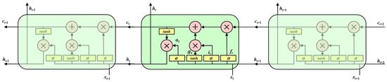 LSTM was proposed to address the long-term dependence encountered by traditional RNNs when processing long sequence data, they are still constrained by their unidirectional processing. To overcome this limitation, Bi-LSTM was introduced []. Bi-LSTM performs operations on the forward LSTM and on the backward LSTM. Figure 3 shows backward LSTM in Bi-LSTM.
