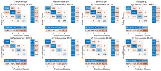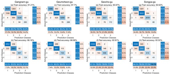 Confusion matrix result before input selection by station: (a) Confusion matrix for the result of the training data in Gangnam-gu; (b) confusion matrix for the result of the test data in Gangnam-gu; (c) confusion matrix for the result of the training data in Geumcheon-gu; (d) confusion matrix for the result of the test data in Geumcheon-gu; (e) confusion matrix for the result of the training data in Seocho-gu; (f) confusion matrix for the result of the test data in Seocho-gu; (g) confusion matrix for the result of the training data in Songpa-gu; (h) confusion matrix for the result of the test data in Songpa-gu.