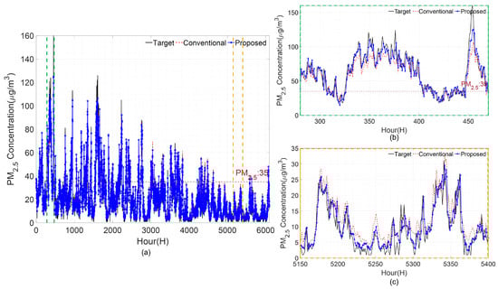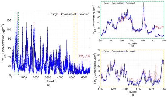 Results of the PM concentration forecast by deep learning model at the Songpa-gu station: (a) Test data section, (b) high-concentration section, and (c) low-concentration Section.