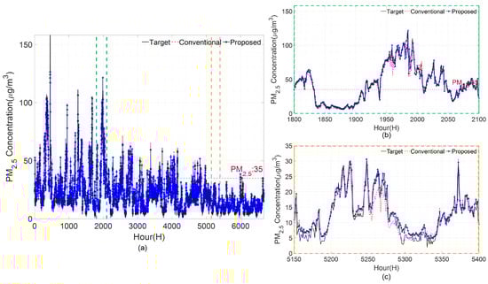 In Figure 6, Figure 7, Figure 8 and Figure 9b, the high-concentration range of each station, it can be seen that the conventional method under forecasts the proposed method because it is trained with a bias towards low-concentration, which is the major class data.