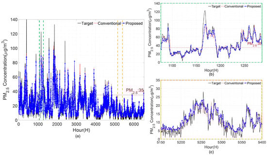Results of the PM concentration forecast by deep learning model at the Seocho-gu station: (a) Test data section, (b) high-concentration section, and (c) low-concentration section.