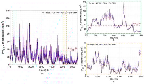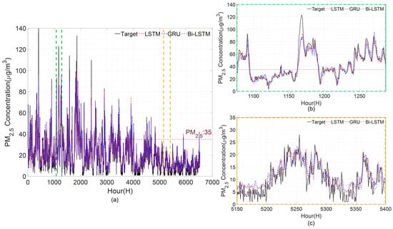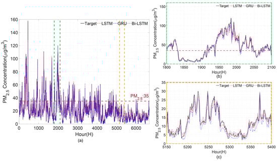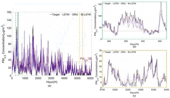 Results of the PM concentration forecast by deep learning models at the Gangnam-gu station: (a) Test data section, (b) high-concentration section, and (c) low-concentration section.