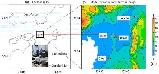 The present study focuses on the Osaka region (Figure 1), a city situated along the Pacific coast in western Japan. The coastal areas in and around Osaka are predominantly flat and overlook the Seto Inland Sea. The reason behind selecting this particular region for the study is that Osaka and the Seto Inland Sea are enclosed by mountains, resulting in weaker winds in comparison to regions facing expansive oceans such as the Japan Sea and the Pacific. Additionally, the surface conditions in Osaka are complex due to the mixture of urban–rural areas and land–water interfaces, requiring vertical wind profiling.