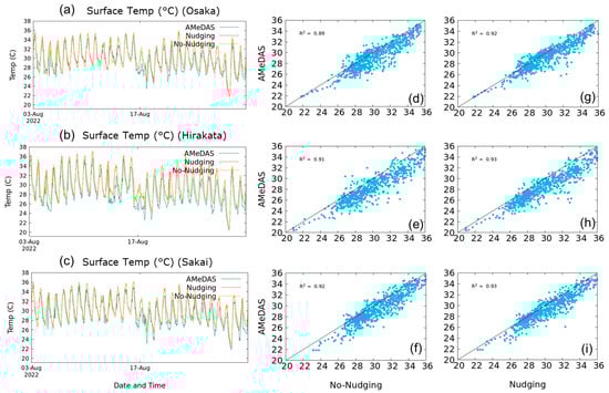Comparison of (a–c) the time series of temperature for August 2022 from the model simulations with AMeDAS observation at three different stations; and (d–i) the correlation between them.