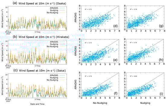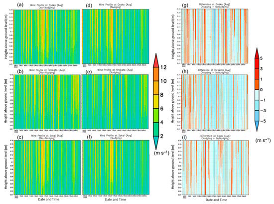 Time series of the vertical profile of the wind speed for August 2022 from the simulations with (a–c) no nudging and (d–f) nudging at three AMeDAS station points; (g–i) the difference between the two simulations.