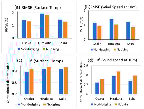 To assess the performance of the simulations, we calculated RMSE and the correlation between the hourly datasets from the simulations and the AMeDAS observations. The nudging simulation exhibited an improvement in the RMSE for hourly temperature, with reductions of up to 0.2 °C observed at all locations (Figure 4a). Furthermore, we observed an enhancement in the correlation between the observed and nudging-simulated temperature, with increases of up to 3% for hourly data (Figure 2d–i and Figure 4c). Similarly, the nudging simulation demonstrated a decrease in the RMSE for hourly wind speeds by up to 0.4 m s–1 (Figure 4b). Additionally, the correlation of the hourly wind speed increased by up to 8% after incorporating lidar-based observation nudging into the simulations (Figure 3d–i and Figure 4d). These results suggest that the nudging method is effective in enhancing the accuracy of both temperature and wind speed simulations, thus demonstrating its potential for improving the performance of WRF model simulations.