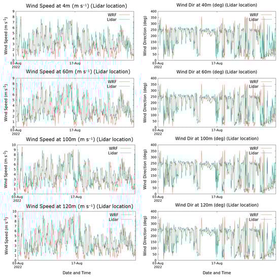 Comparison of the time series of wind speed (left panel) and wind direction (right panel) for August 2022 from the model simulations with lidar observation at different heights between 40 and 120 m.
