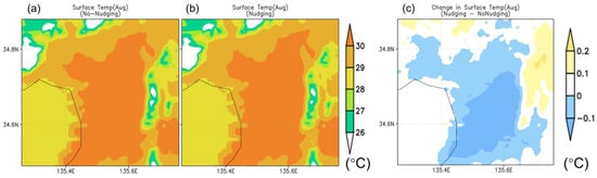 In August, the mean temperature in the Osaka region is consistently high, with temperatures in the Osaka plain region even warmer and up to 1–2 °C higher than other parts of the study area (Figure 6). The comparison of the nudging simulation with the no-nudging simulation showed that temperatures were higher in the nudging simulation over land areas over 300 m above sea level. Conversely, in lower altitude regions, the nudging simulation generally showed lower temperatures compared to the no-nudging simulation, with a few exceptions. By incorporating observation nudging, the temperature increased by 0.2 °C or more in many high-altitude regions, while it decreased by 0.1 °C or more in some coastal areas (Figure 6c). These results suggest that the use of observation nudging improved the temperature predictions in certain regions, particularly at higher altitudes.