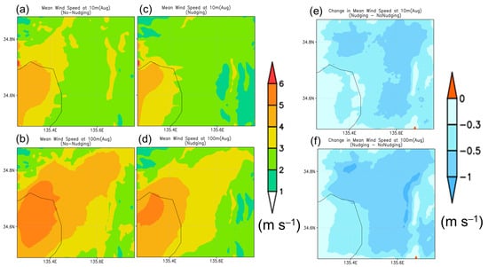 Mean wind speed for August 2022 distribution from the simulations with (a–b) no nudging and (c–d) nudging at 10 m height level (upper panel) and 100 m height level (lower panel); (e–f) the difference between the two simulations.