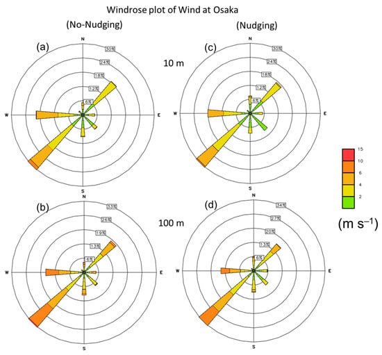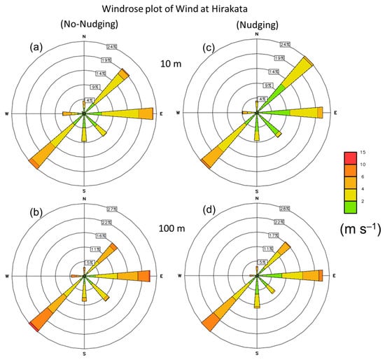 Same as Figure 8, but at the Hirakata AMeDAS station point with (a–b) no nudging and (c–d) nudging at the 10 m height level (upper panel) and 100 m height level (lower panel).