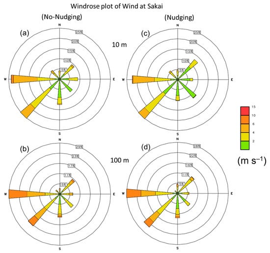 Same as Figure 8, but at the Sakai AMeDAS station point with (a,b) no nudging and (c,d) nudging at the 10 m height level (upper panel) and 100 m height level (lower panel).