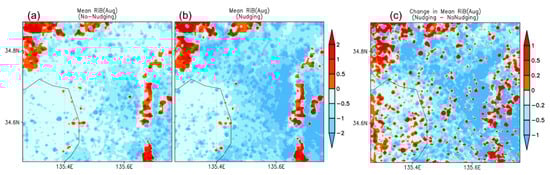 Monthly mean Bulk Richardson number (RiB) distribution for August 2022 from the simulations with (a) no nudging and (b) nudging; (c) the difference between the two simulations.