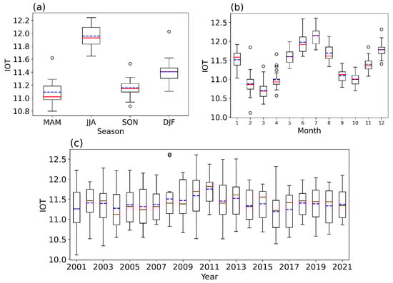 The temporal variation of IOT extracted from MODIS satellite data from 2000 to 2021 is depicted in Figure 1. The solid red line represents the median value of IOT, and the blue dashed line represents the average value. Figure 1a,b shows the seasonal and monthly average IOT (2000–2021) based on the MODIS satellite level-3 data. The months of June–August (JJA) and March–May (MAM) have the highest and lowest seasonal average IOT, respectively, which suggests that the IOT is significantly affected by seasonal changes. The monthly average IOT varies in a “W” shape from January to December and reaches a maximum of 12.15 in July. The IOT begins to decrease after December and reaches a minimum value of about 10.7 in March, then gradually increases before the end of July. The monthly average IOT is down to peaks in March and October, respectively. The interannual variation of IOT is not obvious (Figure 1c). The annual average value of IOT is about 11.4, the maximum, of about 11.75, is reached in 2011, and the minimum, of around 11.19, is reached in 2016. From 2004 to 2009, the median value of IOT is lower than the annual average value, indicating that more than half of the IOT values are less than the average value. However, from 2010 to 2020, the tendency is in the opposite direction, which implies that IOT may be pulled down by thin ice clouds. At the same time, the global IOT shows a slow increase trend before 2011 and a slow decrease in devices from 2011 to 2021.
