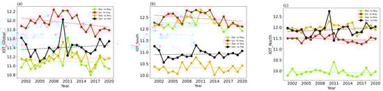 Figure 2 shows the variation trend of the seasonal average IOT with year. For global average IOT, it attains its highest level in June–August, and its lowest point in March–May (Figure 2a). In addition, there is a decreasing tendency in these seasons. The slopes of seasonal average IOT are −1.0 × 10−2/year in June–August and −3.0 × 10−3/year in March–May, respectively. The Pearson’s R of the average IOT is −0.368 in June–August; this indicates that the average IOT is negatively correlated with time. However, there is an increasing tendency in September–November and December–February in the next year; their slopes are 2.0 × 10−3/year and 5.0 × 10−3/year, respectively. In the Southern Hemisphere, the seasonal average IOT achieves its minimum in September-November and its maximum in June–August (Figure 2b). Moreover, the Southern Hemisphere’s seasonal average IOT has an upward trend from spring to winter. For the seasonal average IOT in the Northern Hemisphere, it approaches its minimum in March–May and its maximum in September–November (Figure 2c). The IOT in the Northern Hemisphere shows the “^” trend with the seasons. From 2001 to 2020, the seasonal average IOT in June–August shows an obviously decreasing tendency; the slope is −1.4 × 10−2/year in the Southern Hemisphere and −7.0 × 10−3/year in the Northern Hemisphere, respectively.