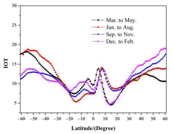 For the middle and low latitude regions, the annual average IOT decreases first and then increases with the increase in latitude from ±6° to 60°. For mid-latitudes, the IOT varies more rapidly with latitudes in the northern hemisphere than in the southern hemisphere, and the variation of IOT with longitude is more obvious in the northern hemisphere than in the southern hemisphere.