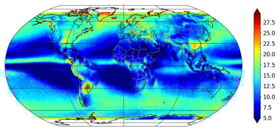 The MODIS instrument is carried by NASA’s Terra and Aqua satellites, and their corresponding transit periods are 10:30 and 13:30 local time. The MODIS is designed to monitor the atmosphere, oceans, and terrestrial ecosystems on a worldwide scale [30,31,32]. The MODIS measures spectrum ranges from the visible to the infrared, divided into 36 different spectral bands, with an observation swath of 2330 km. Three different levels of MODIS data are accessible. Cloud phase, cloud-top attributes, and cloud optical properties have been incorporated into MODIS level-2 and level-3 cloud products, and the level-3 dataset is generated from the level-2 data products. The global atmospheric parameters are averaged on a 1° × 1° grid; this means that the level-3 products correspond to a longitude of 360 pixels and a latitude of 180 pixels. In this research, the Terra satellite cloud products (MOD08_M3_v6) are employed to study the spatiotemporal distributions of IOT. You can find more information about the algorithm for obtaining cloud parameters at http://modis-atmos.gsfc.nasa.gov (accessed on 1 February 2023).