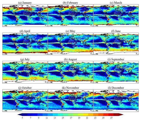We are very grateful to the MODIS product dataset provided by NASA Goddard Earth Science Distributed Active Archive Center (GESDAAC). All monthly MOD08 datasets can be obtained from the website: https://ladsweb.modaps.eosdis.nasa.gov/ (accessed on 1 February 2023). The authors also sincerely thank the anonymous reviewers and editor for their constructive opinions and suggestions.