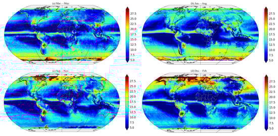 Figure 6 depicts the distribution of the seasonal average IOT during the period of 2000–2021. There is obvious seasonal variation, and the seasonal variations in IOT are different in different regions. For the tropics west of the prime meridian, the area with the largest IOT is located in the northern hemisphere. Figure 3 and Figure 6b,d indicate the existence of ITCZ, which is clearly moving south and is more evident over land. For most parts of the midlatitude region, the highest value in IOT occurs in winter in each hemisphere; however, the lowest value of IOT occurs in spring in the Northern Hemisphere and summer in the Southern Hemisphere. The intensity of solar radiation and the amount of water vapor present in the atmosphere fluctuates with the seasons and these are seen as the most plausible causes of seasonal change of IOT [40]. However, over northern China and the Tibetan Plateau, the IOT is at its highest in the summer (from June to August) and at its lowest (from December to February). Both the Amazon Plain and the Brazilian Plateau’s IOT displayed similar seasonal variations, with the IOT reaching its lowest point in winter (from June to August) and its highest point in summer (from December to February).