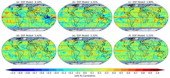 The spatial distribution of mode (1–6) for the global IOT: (a) mode 1; (b) mode 2; (c) mode 3; (d) mode 4; (e) mode 5; (f) mode 6.