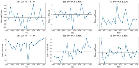 The first six EOF modes for the global IOT are spatially distributed in Figure 8. There are positive and negative distribution types, which denote two opposing trends, in the distribution of the space field of the first EOF mode (Figure 8a). It is negative in Indonesia, much of Australia, the southern Caribbean, and the Queen Charlotte Islands off the Pacific Ocean’s east coast, with the largest absolute value of negative values in the Maluku Islands. Positive values can be found in the western Pacific Ocean close to the equator, the Hawaiian Islands, the border between Russia and Kazakhstan, and the Pacific Ocean near the equator. Figure 9 displays the series of time coefficients corresponding to each EOF mode in Figure 8. Figure 9a illustrates that between the years 2002 and 2011, the PC1 changes from positive to negative and displays a trend of steadily declining values. The PC1 moves from being negative to positive between 2011 and 2015, displaying a trend of progressive increase and reaching the minimum and highest values in those years, respectively. This is the same result as in Figure 1c. For negative regions with high absolute values (such as Indonesia), the IOT increases between 2002 and 2011 and gradually declines between 2011 and 2015. For areas with high positive values (such as the Pacific Ocean close to the equator), the IOT exhibits a progressive decline from 2002 to 2011 and an increase from 2011 to 2015.