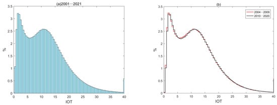 The probability distribution of IOT: (a) 2001–2021, (b) 2004–2009, and 2010–2020.