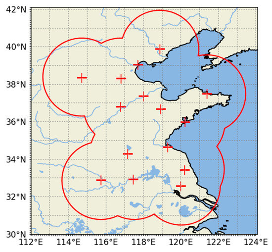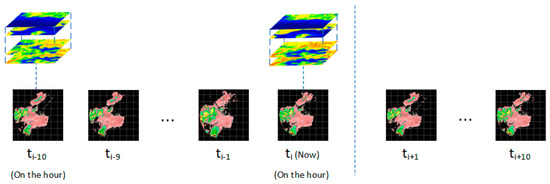 The radar echo data are obtained from S-band Doppler weather radar data provided by the China Meteorological Administration, involving 15 radar sites at different locations in North and East China [30,31]. The stations’ locations and scanning ranges are shown in Figure 1. The scan period is from May 2015 to October 2016. The radar completes a scan every 6 min on average, and the scan radius is up to 230 km. Each scan includes nine elevation angles from 0.5° to 19.5°. Based on the above data, the composite reflectivity image is obtained according to the following steps: Firstly, the radar base data is converted from polar coordinate format to Cartesian coordinate format by bilinear interpolation in the horizontal dimension. Then, it is interpolated in the vertical direction to obtain three-dimensional equidistant grid point field data with a horizontal resolution of 2 km × 2 km and a vertical resolution of 0.5 km. The height ranges from 0.5 km to 7.5 km. Finally, select the maximum value in all height layers to generate a 256 × 256 radar composite reflectivity image. As shown in Figure 2, every successive 21 radar composite reflectivity images are considered a sample, and each image’s size is 256 × 256, where the 11th image must be scanned within 3 min before and after the hour. The first 11 images in the sample are used as model inputs, and the last 10 images are used as real labels. A total of 9539 samples are collected under the condition that the sample contains strong echoes continuously. The samples are randomly divided into a training set: validation set: test set = 4:1:1, with the numbers of training, validation, and test samples being 6360, 1590, and 1589, respectively.