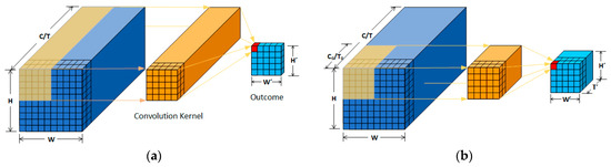 In recent years, a convolutional neural network (CNN) has been considered one of the core algorithms in the field of image processing. It can fully learn the features of an image using a small number of parameters while preserving the spatial structure of the image. However, traditional 2D convolution has some limitations in processing video data. Assuming the size of a video is T × H × W (T is the number of frames of the video, H is the height of a frame, and W is the width of a frame), the 2D convolution kernel will perform the convolution operation in the dimension of H × W and output a single image. Hence, it will completely lose temporal information, as shown in Figure 3a.