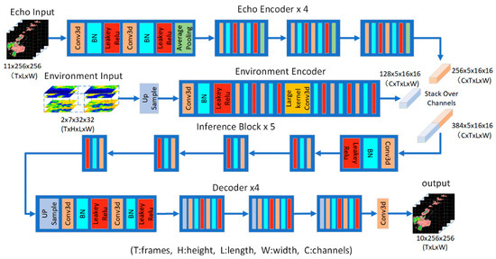 We use a late fusion strategy to fuse the echo sequence and environmental information [35]. The neural network consists of four main components: the radar echo encoder, the environment field encoder, inference, and decoder. The network structure is shown in Figure 4. Detailed parameters are shown in Appendix A, Table A1 and Table A2.