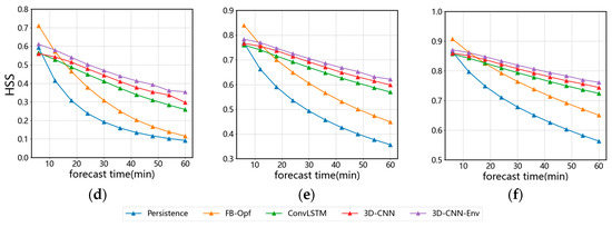 More detailed evaluation results are shown in Figure 5. Each graph represents the trend of CSI or HSS scores with an increase in lead time. It can be seen that: (1) as the lead time increases, the CSI and HSS scores of the five models invariably show a decreasing trend. The score of the optical flow method and constant extrapolation decreased significantly more than 3D-CNN and ConvLSTM models. (2) The optical flow method performs best at the first prediction moment (6 min) and is on par with the best overall performing 3D-CNN-Env model at the second prediction moment (12 min), but then it declines rapidly all the way down. (3) Among the four extrapolation models without environment fields, the 3D-CNN model shows the best performance, the ConvLSTM model is the second best, and the constant extrapolation is the worst. (4) Compared to the best-performing 3D-CNN model, the introduction of the environment field improves the score by 2%.