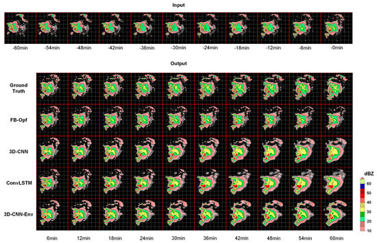 In order to visually evaluate the improvement of the environment field on the radar echo extrapolation, we chose two cases to illustrate it. Figure 6 shows a visual comparison of the radar echo sequence observed at Bingzhou station on 13 June 2016 at 8:06–9:00 and the results obtained from the three extrapolation models. The model inputs are all the observed sequences on 13 June 2016 at 7:00–8:00.