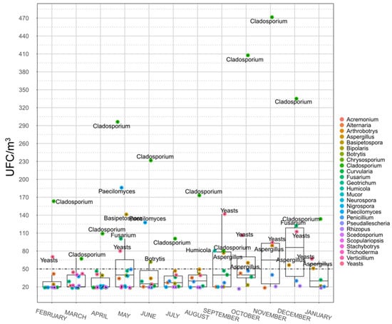 - Flores, M.E.; Medina, P.G.; Camacho, S.P.; de Jesús Uribe Beltrán, M.; De la Cruz Otero, M.D.; Ramírez, I.O.; Hernández, M.E. Fungal spore concentrations in indoor and outdoor air in university libraries, and their variations in response to changes in meteorological variables. Int. J. Environ. Health Res. 2013, 24, 320–340. [Google Scholar] [CrossRef]