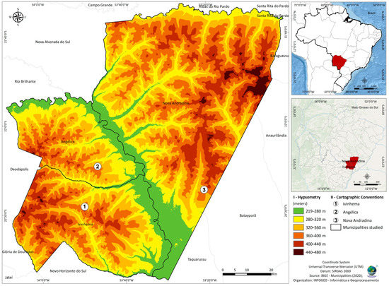 Map of the altitudes of the cities evaluated in the Ivinhema Valley in the southeastern region of Mato Grosso do Sul, highlighting the sampling points.
