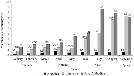 In Figure 2, it is possible to identify significant seasonal and spatial patterns in the frequency of MCN: values three to nine times higher between June and September (winter and early spring) for the cities of Ivinhema and Nova Andradina and low values throughout the year in the city of Angélica. There was also a significant increase in MCN for the cities of Nova Andradina and Ivinhema from the beginning of the experimental period (January—summer) to its end (September—spring); the city of Angélica had low MCN throughout the experimental period.