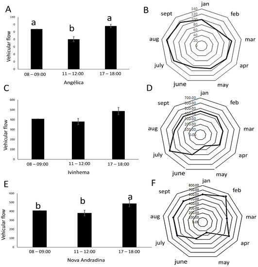 In cities, in general, it was found that the highest vehicle flow occurred between 5:00 pm and 6:00 pm in the cities analyzed. In between 11:00 am and 12:00 pm, a significant difference in vehicle flow was observed for the cities of Angélica when compared to Ivinhema and Nova Andradina. Statistical differences were identified between the traffic schedules for the city of Angélica (p = 0.001), with the morning (08:00–09:00 h) and the afternoon (17:00–18:00 h) being the hours of higher traffic peaks with higher mean flow in the month of August, differing statistically from the period of 11:00–12:00 (Figure 3A,B). No differences were identified between the times for the city of Ivinhema (p = 0.11) (Figure 3C,D). However, in July, higher values of vehicular flow were recorded. In Nova Andradina, there was a significant difference between the times (p = 0.007), showing intense vehicle flow between 17:00 and 18:00, with higher averages in February (Figure 3E,F).