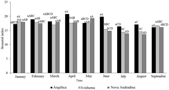 It was possible to observe a significant seasonal and spatial pattern for the SI: when comparing the cities within each month, significantly higher Sis were observed for T. pallida in the city of Angélica in the months of April, June, July, and August, which was autumn and winter; when comparing the months for each city, only Ivinhema and Nova Andradina showed a significant drop in the SI in the months of June to August, which was exclusively during the winter (Figure 4).