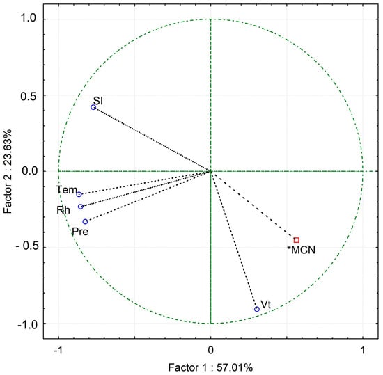 Principal component analysis (PCA) of the environmental variables temperature (Temp), relative humidity (Rh) and precipitation (Pre), in addition to vehicle traffic (Vt), frequency of micronuclei (*MCN) and stomatal index.