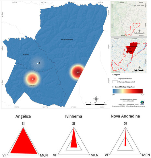 Kernel interpolation map showing the spatial distribution of pollution intensity in the cities: Angélica, Ivinhema and Nova Andradina, southeastern part of the state of Mato Grosso do Sul (upper image). Analysis of the triad of pollution indicators for the stomatal index (SI), micronucleus (MCN) frequency, and vehicle flow (VF) represented in the radar chart on the map (lower image).