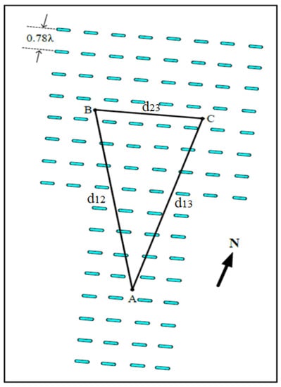 The operational frequency of the Chung-Li VHF radar is 52 MHz (corresponding to a wavelength of 5.77 m). The antenna array used exclusively for interferometry measurements of ionospheric irregularities in the Chung-Li VHF radar antenna field consists of three rectangular antenna subarrays arranged as an isosceles triangle in shape, and each subarray is composed of 32 (4 × 8) linearly polarized 4-element Yagi antennas. The side lengths of the triangle are d12 = d13 = 37.1 m and d23 = 18 m, respectively. The boresight of the antenna beam of each antenna subarray is pointed in the direction of 19.16° west of geographic north in azimuth and 50.2° in elevation. The 3 dB beam width of the two-way antenna pattern of each subarray is 7.8° in elevation and 18° in azimuth []. The configuration of the ionospheric antenna array of the Chung-Li VHF radar is shown in Figure 1.