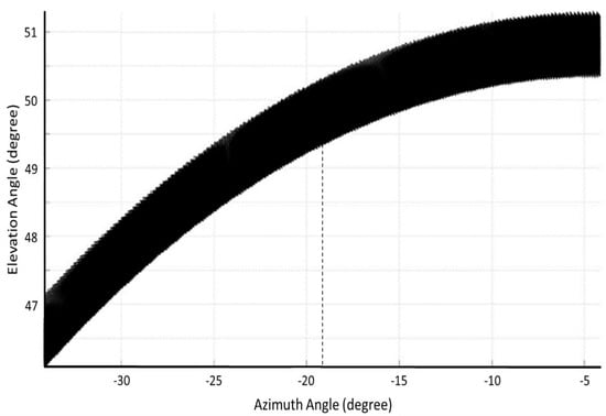 Because of the field-aligned property of the ionospheric electron density irregularities at meter scale, the backscatter from the 3 m FAIs can only be detected and analyzed by a VHF radar within a specific echoing region that is determined by the physical antenna beam pattern and the aspect angle. This region is referred to as the expected echoing region thereafter that designates the potential echoing region of the ionospheric FAIs, which can be acquired from the International Geomagnetic Reference Field (IGRF) model combined with the geographic coordinate of the radar station [,,]. In other words, the expected echoing region is determined by the effective antenna beam pattern that is defined as the product of the transmitted (physical) radar beam pattern and aspect sensitivity of the FAI backscatter. Every coherent scatter radar has its own unique expected echoing region that stipulates a specific region where the ionospheric FAI echoes can be detected by the radar. In light of the fact that the aspect angle is usually very small (usually less than 0.2°) [], the expected echoing region is anticipated to be relatively broad in the geomagnetic zonal direction and very narrow in the geomagnetic meridional direction. Figure 2 shows the expected echoing region of the ionospheric antenna array of the Chung-Li VHF radar, in which the aspect angle of 0.2° is set and the height range of 90–130 km for the presence of FAIs is assumed. As anticipated, the configuration of the expected echoing region of the Chung-Li VHF radar is a concave down region extending in a geomagnetic zonal (azimuth) direction and restricted in the geomagnetic meridional (elevation) direction. Therefore, it is expected that the interferometry-resolved FAI echoes for the Chung-Li VHF radar should be within this highly anisotropic echoing region.