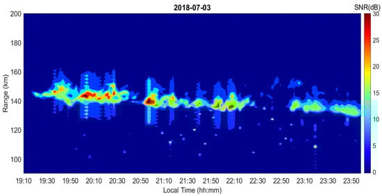 Range-time-intensity contour plot of the Es FAI echoes observed by Chung-Li VHF radar on 3 July 2018. The artificial echoes caused by the sidelobe of the autocorrelation function of the Barker code, which symmetrically distribute in range above and below the main echo regions, are clearly seen.