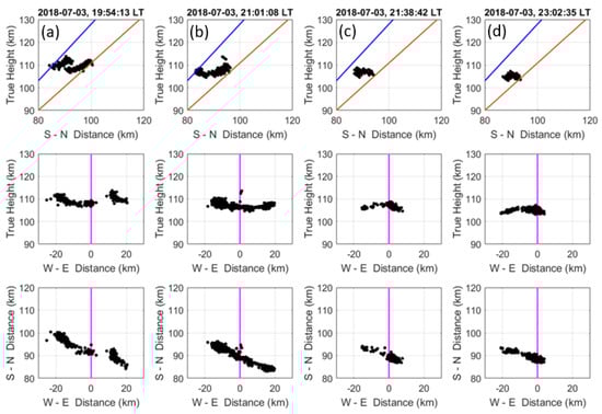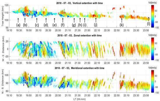 Figure 4 displays the time sequences of interferometry-resolved echoing regions projected on vertical (top), azimuth (or zonal) (middle), and meridional (bottom) planes, respectively, in which the Doppler velocities are superimposed on the echoing regions to indicate the dynamic property of the 3 m Es FAIs. In the top panel of Figure 4, there is a trend for the main body of the Es layer to descend at a lapse rate of about 2.17 km/h, which is basically in line with the downward phase velocity of semi-diurnal tide [,,]. In addition to the steadily descending Es echoes, the observed Doppler velocities of Es FAI echoes show prominent quasi-periodical variations. Moreover, height-extended echo bulges occurred quasi-periodically during the period from 19:30 to 22:20 LT, which are consistent with those present in Figure 3. All of these features, combined with the quasi-periodic oscillations in the echo intensities present in Figure 3, strongly suggest that the Es FAIs were subjected to a forcing of external wave-like events to move alternately away and towards the radar quasi-periodically. The major causes of these quasi-periodical oscillations in the Es FAI echoes are very likely the atmospheric gravity waves propagating through the Es layer, which will be shown in a later section.