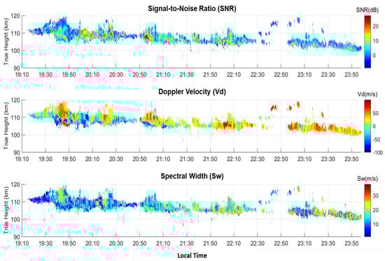 These echo bulges shown in Figure 3 and Figure 4 are characterized by intense echo intensities, large height extents, strong Doppler velocity, and broad spectral width, which can be seen in Figure 5. Some of them are marked with arrows and labels (b), (d), (f), (h), (j), and (k) in Figure 4 for further comparisons. Besides the echo bulges, quasi-periodic modulations of the Es echoes in height can also be discerned, although they are minor and weak. The middle and bottom panels of Figure 4 exhibit zonal and meridional movements of the Es FAI echoes over time, in which 0 km labeled on the ordinate of the azimuth plane indicates the boresight of the radar beam and positive (negative) values represent the distances of the FAI echoes away from the boresight toward east (west). The numbers labeled on the ordinate of the meridional plane represent the distances of the FAI echoes north of the radar site. It has been shown that the plasma structures responsible for the striation-like Es FAI echo patterns on the zonal or meridional planes should be a moving thin Es layer intercepted by the expected echoing region, and those in a blob shape are the result of a moving plasma structure in a clump type intercepted by the expected echoing region []. Therefore, the plasma structures responsible for the Es FAI echoes for the present study are varied and diverse.