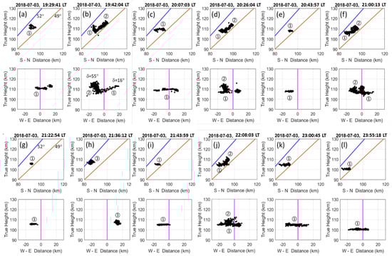 Figure 3 shows that the range-time-intensity contour plot of the Es layer echoes observed by the Chung-Li VHF radar echoes on 3 July 2018, from 19:10 to 23:58 LT. The main body of the Es echoes descended from 148 km to 132 km at a mean range rate of 3.2 km/h. It is important to note that a 13-bit Barker code was employed to observe the Es FAI echoes in the radar experiment. As a result, unnatural echoes induced by the side lobe of the autocorrelation function of the Barker code were present symmetrically on the upper and lower sides of the main echo regions, which are 22.3 dB weaker than the main echoes. These artificial echoes should be carefully identified and removed from the raw data such that the true Es layer echoes can be correctly analyzed and the Es FAIs can be positioned in the expected echoing region using the interferometry technique. As shown in Figure 3, the whole sequence of the Es FAI echoes consists of four individual segments, in which evident quasi-periodic oscillations not only in FAI echo intensity but also in range extent can be clearly seen. The oscillation periods of the first and second segments are, respectively, about 20 min and 9.5–17.5 min with large oscillation amplitudes, while those of the third and fourth segments with minor oscillation amplitudes are short (less than 9 min) and varied. These features seem to suggest that the causes of the quasi-periodic oscillations of the Es FAI echoes are very likely the results of propagating gravity waves with different periods. In the following, using the interferometry technique mentioned in Section 2, three-dimensional spatial structures of the FAIs echo regions are reconstructed to investigate the responses of the Es layer to the propagations of the gravity waves effect, including modulation of the Es layer, change in the shape of the Es FAI echoing patterns, and the dynamic behavior of the FAIs caused by the gravity-wave-induced polarized electric field and propagation.