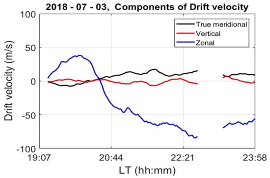 Time series of the drift velocity components of FAI echoes in zonal (blue curve), meridional (black curve), and vertical (red curve) directions, which are estimated from the movements of the echoes in respective directions over time, as shown in Figure 4.